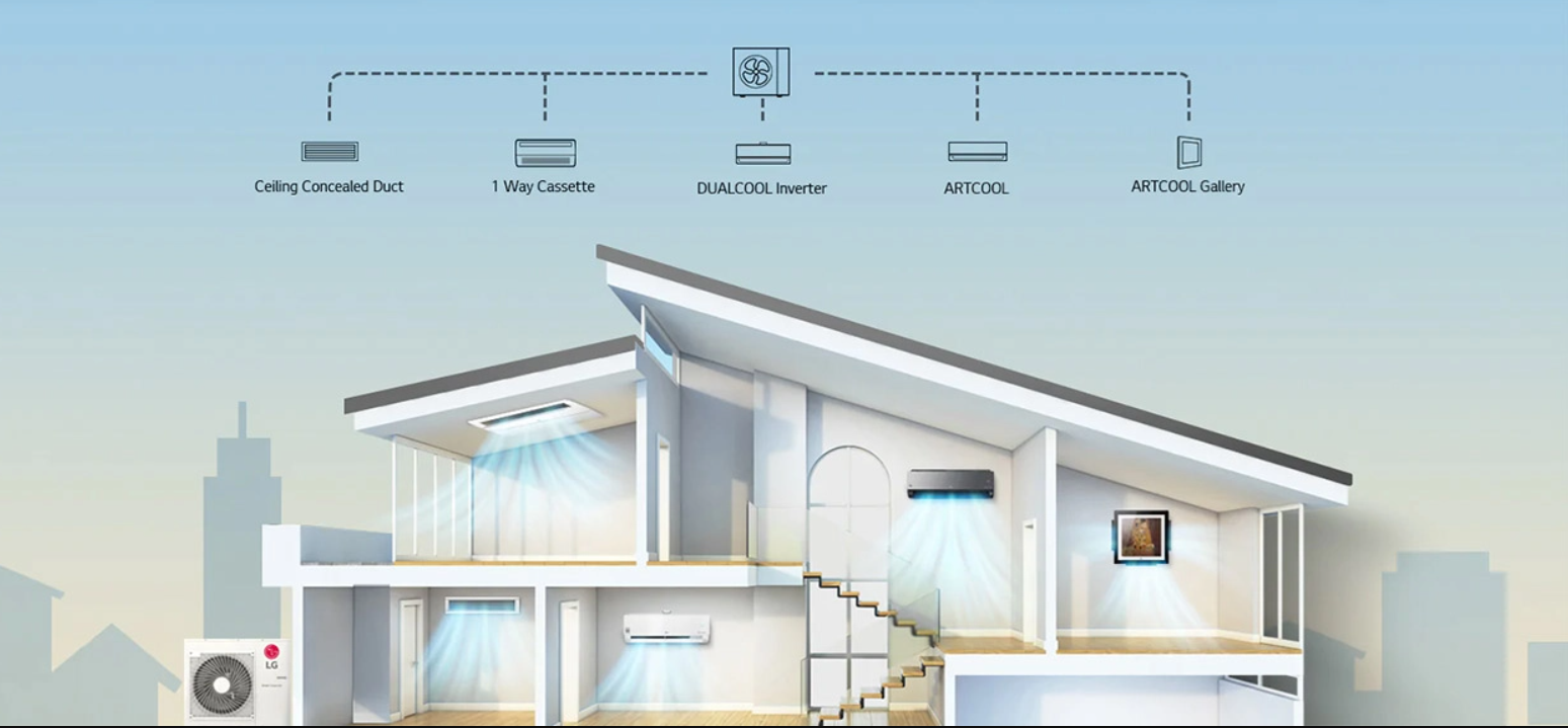 Na obrázku je znázorněn princip multisplitového systému, kdy je jedna venkovní jednotka napojena na více vnitřních jednotek v různých místnostech domu nebo bytu. Každá místnost může mít jiný typ vnitřní jednotky (nástěnná, kazetová, kanálová apod.) a každá se ovládá samostatně podle potřeby uživatele.