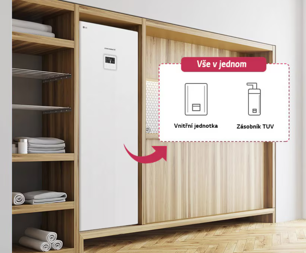 LG THERMA V Split Combi je komplexní řešení vytápění a ohřevu teplé vody v jednom kompaktním systému. Kombinuje výkonné tepelné čerpadlo typu vzduch–voda s integrovaným zásobníkem teplé vody, čímž šetří místo a zjednodušuje instalaci. Je ideální volbou pro novostavby i modernizace rodinných domů.