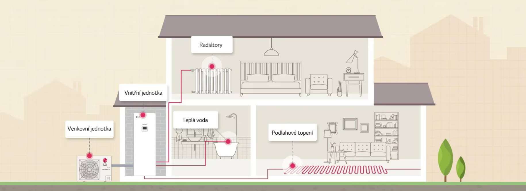 Samozřejmostí je možnost propojení s chytrou domácností prostřednictvím komunikace MODBUS a moderního ovládání LG přímo na vnitřní jednotce, nebo lze využít ovládání přes Wi-fi, které umožňuje pohodlné řízení celého systému. Výsledkem je tichý, úsporný a technologicky pokročilý systém vytápění, který zajišťuje maximální komfort po celý rok.